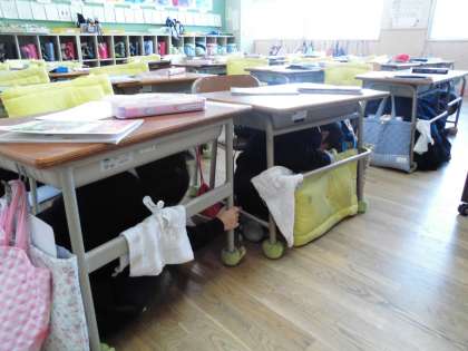 昨年の12月に国連総会で11月5日が「世界津波の日」と採択されました。本校では「世界津波の日」の前日の11月4日に避難訓練を行いました。通常の避難訓練では事前に教員と児童に避難訓練の時間を予告していますが、今日の避難訓練は日にちも時間も全く知らせずに、抜き打ちで行いました。前触れもなく突然に緊急地震速報の放送が流れ、子ども達は驚いていましたが、落ち着いて机の下に避難することができました。