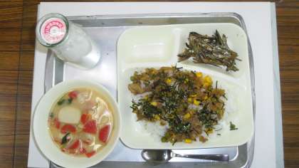 1月12日(木)、3学期2回目の給食はお正月行事献立でした。「雑煮」「きんぴらちらし」「ごまめ」と牛乳でお正月を祝いました。子ども達はお正月らしいにぎやかな料理に喜んでいました。