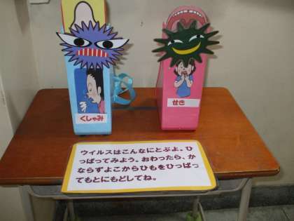 そのなかに、咳エチケットの大切さが書かれたカードもあります。 咳で3メートル、くしゃみで5メートルウイルスは飛びます。 どれくらいの距離か・・ 引っ張って ウイルスが飛ぶ距離を目で見て体験でいるコーナーも作りました。
