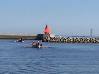 大阪湾は波も静かで絶好のカッター日和です。みんな力を合わせてオールを漕いでいます。