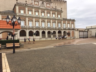 スペイン村は雨が上がり、雨具なしでアトラクションを楽しんでいます。広いパーク内を歩き回り、充実感でいっぱいです。