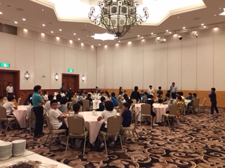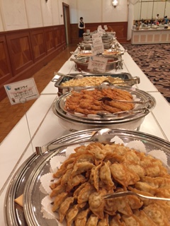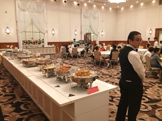 バイキングの続きです。さあ、お待ちかね「いただきます」。シャンデリアが輝く広い部屋で楽しい夕食です。