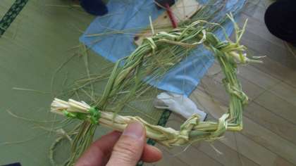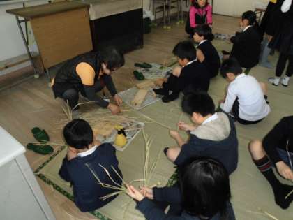 12月22日(金)、3年生は藁で正月飾りを作りました。この藁は3年生が育ててきた稲です。「住吉歴史の会」の方々に来ていただき、飾りの作り方を教えていただきました。3年生は、はじめはぎこちない手つきでしたが、だんだんと慣れてきて立派な正月飾りができました。