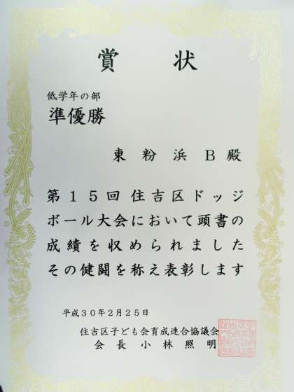 2月25日(月)、住吉スポーツセンターにおいて「住吉区ドッジボール大会」が開催されました。参加児童700名の中で、本校からは120名参加いたしました。2月から毎週日曜日に地域の方々が練習をしていただき、本校児童は練習の成果を存分に発揮し、高学年の部で準優勝、低学年の部で準優勝と3位となり、好成績をおさめました。練習、引率、応援をしていただきました地域・保護者の皆様に深く感謝申しあげます。