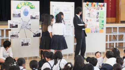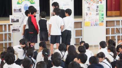 夏休みの自由課題として出していた「安全マップ」を6年生の2チームが作ってくれました。一つのチームは、住吉区全体の防災についてまとめてくれていました。区役所に行ってインタビューしたり、非常持ち出し袋にはどんなものがどれだけ必要かも詳しく書いてくれていました。もう一つのチームは東粉浜地域について調べてくれました。どこにどんな防災グッズがあるかを地図に書き込んだり、町の様子を写真にとったりしてわかりやすい地図ができていました。このチームは校長先生に話を聞いたりもしていました。今日は、日本損害保険協会の鈴木さんと寺島さんに来ていただき、2つの安全マップについて解説してもらいました。校長先生のように防災に詳しい人の話を聞いたり区役所の人に聞いたりすることはとてもいいことだと褒めてもらいました。どちらの地図も工夫されていてわかりやすいとも言ってもらえました。
