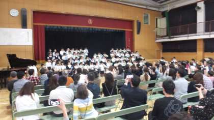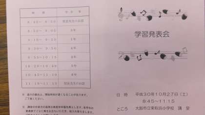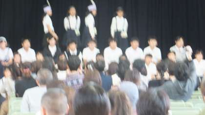 学習発表会をしました。今まで学習してきたことをもとに群読、呼びかけ、寸劇、歌、合奏などで保護者の方、地域の方に伝えました。1年は、気持ちを一つにして「子犬のマーチ」を演奏しました。歌「パレード」詩「あいうえおのうた」「あるけ あるけ」。2年は、町たんけんで見つけた場所を一人一人紹介しました。歌「子犬のビンゴ」。3年は手拍子でリズム表現が息ぴったりのクラッピング」。群読・うた「夕日がせなかをおしてくる」歌「少年少女冒険隊」。4年生の「アフリカン・シンフォニー」の合奏は、迫力満点でした。歌とリコーダー「4年生メドレーー」。5年生は、朗読劇「日本語の調べ」。国語で学習した「注文の多い料理店」「平家物語」「奥の細道」など美しい日本語の文章の暗唱を披露してくれました。6年生は歴史劇です社会科で学習したことを劇にしました。社会見学で行った「ピースおおさ」で見たこと感じたことを、ゲストティーチャーの疎開の話で初めて知ったことを自分たちで台本を作り発表しました。1年生は感想で「楽しかった」4年生は「緊張した」と言っていました。