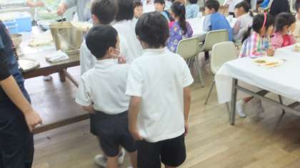 東粉浜幼稚園の年長さんが学校の給食を食べに来ました。メニューはエビフライカレー、キュウリとコーンのサラダ、まめによろこんぶ(大豆とこんぶ)、牛乳です。実際に給食を食べて感想を聞いてみました。「美味しかった」と全員が言ってくれました。5年生が給食を運んでくれて、1年生が配膳をしてくれました。