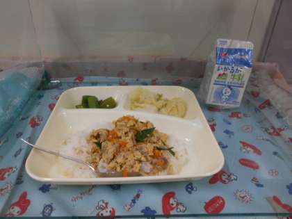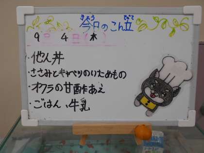 今日の給食は、「他人丼・ささみとキャベツのいためもの・オクラの甘酢あえ・牛乳」です。