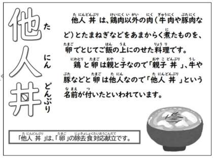 今日は、牛肉と鶏卵を使った「他人丼」です。斜め切りの青ねぎがアクセントになっています。東日本では「豚肉」、西日本では「牛肉」を使うことが多いです。甘辛く味付けされて卵でとじられた他人丼は、子どもたちに人気があります。
