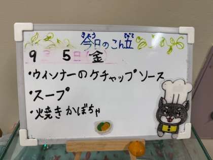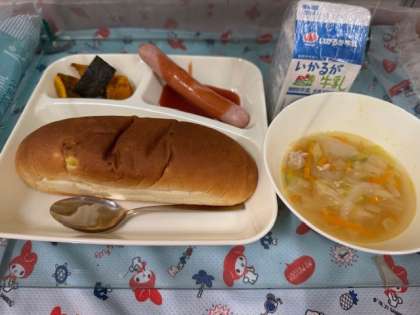 今日の給食は「ウインナーのケチャップソース・スープ・焼きかぼちゃ・おさつパン・牛乳」です。