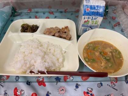 今日の給食は「鶏肉のてり焼き・とうがんのみそ汁・なすのそぼろいため・ごはん・牛乳」です。