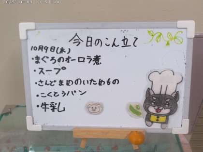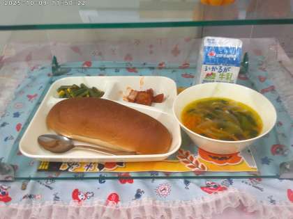 今日の給食は「まぐろのオーロラ煮、スープ、さんどまめとコーンのサラダ、黒糖パン、牛乳」です。