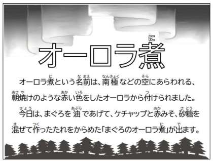 まぐろのオーロラ煮は、子どもたちにとても人気のある献立です。しょうが汁で下味をつけたまぐろ(角切り)に片栗粉をまぶして油で揚げて、ケチャップ、砂糖、赤みそで作ったたれをからませています。