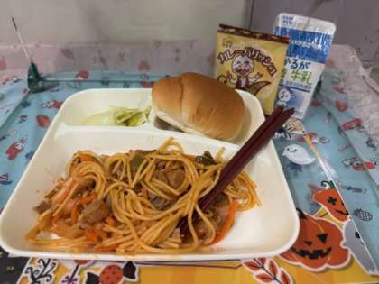 今日の給食は「イタリアンスパゲッティ、サワーキャベツ、カレーフィッシュ、ミニコッペパン、牛乳」です。