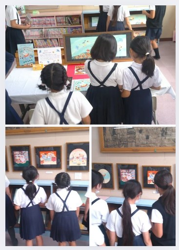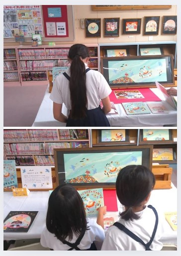 昼休みの図書館開放の時間に、多くの子どもが原画を見に来ていました。
