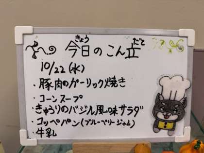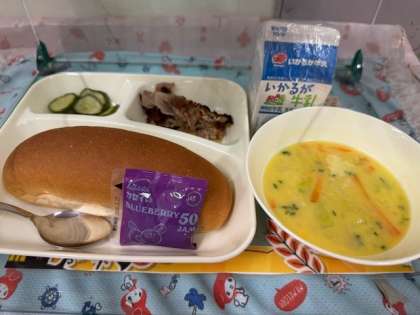今日の給食は「豚肉のガーリック焼き、コーンスープ、きゅうりのバジル風味サラダ、コッペパン、ブルーベリージャム、牛乳」です。