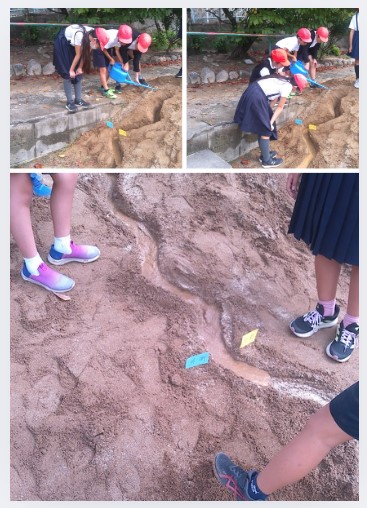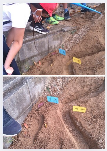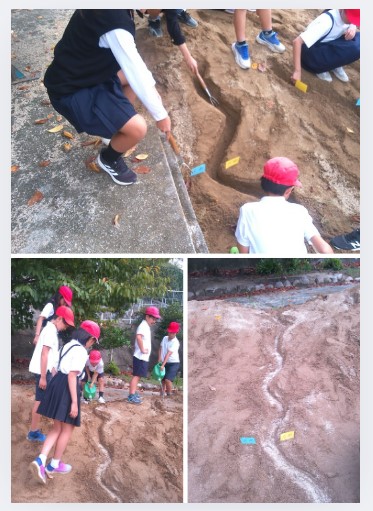 人工的に川を作り、そこに水を流し、カーブの内側と外側の状況の違いを観察しました。