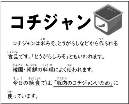 今日の給食は「豚肉のコチュジャンいため、鶏肉とはるさめのスープ、きゅうりのナムル、ご飯、牛乳」です。
