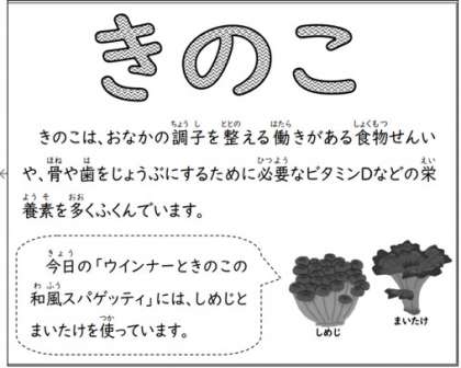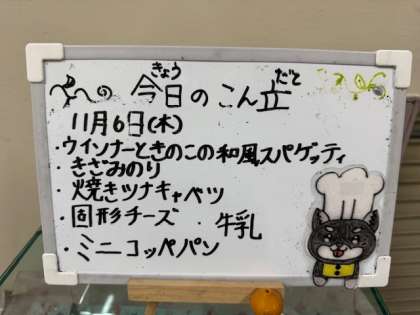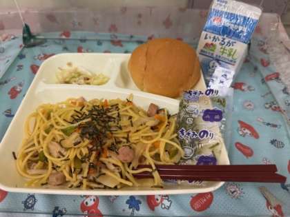 今日の給食は「ウインナーときのこの和風スパゲッティ、きざみのり、焼きツナキャベツ、固形チーズ、ミニコッペパン、牛乳」です。