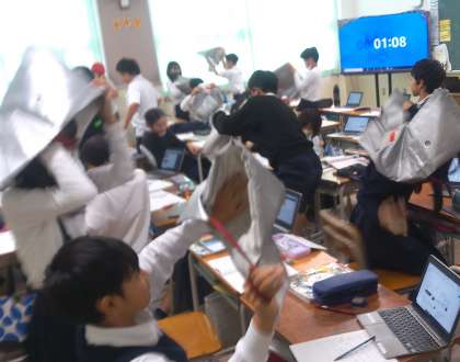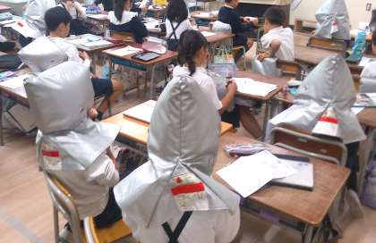 本校でも、屋上のスピーカーからの放送に合わせて、防災頭巾をかぶるなど頭を守る避難を行いました。