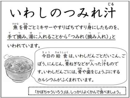 今日の給食は「鶏肉と野菜の煮もの、じゃこ豆、かぶのゆず風味、ご飯、牛乳」です。