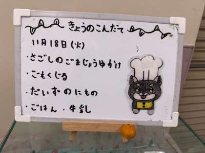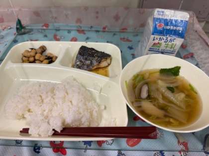 今日の給食は「さごしのごまじょうゆかけ、五目汁、大豆の煮もの、ご飯、牛乳」です。