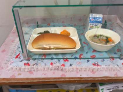 今日は、しめじ、エリンギ、マッシュルームなどのきのこを使った「鶏肉ときのこのクリームシチュー」でした。きのこは低カロリーで、食物繊維や、ビタミンB群、ビタミンDなどの栄養素が豊富です。きのこは苦手という児童が多いですが、ぜひ食べてほしい食品です。