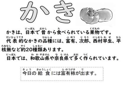 今日の給食は「鶏肉のきのこのシチュー、きゅうりのピクルス、かき(富有柿)、コッペパン、ソフトマーガリン、牛乳」です。