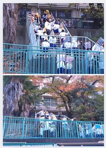 まずは東粉浜小学校へ避難します。さらに津波警報が出たという想定で、非常階段を上がり、住吉中学校まで避難します。