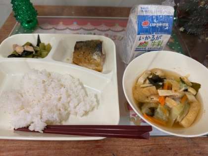 今日の給食は「さばのおろしじょうゆかけ、五目汁、こまつなの煮びたし、ご飯、牛乳」です。