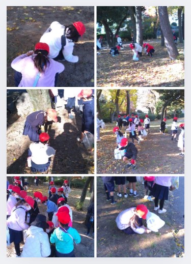 生活科の学習として、みんなで住吉公園まで歩いていき、おちばひろいを行いました。