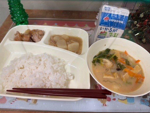 今日の給食は「鶏肉の甘辛焼き、みそ汁、だいこんの煮もの、ご飯、牛乳」です。