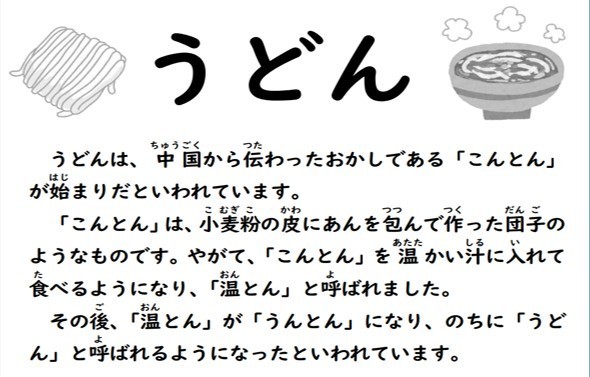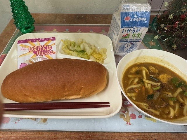 今日の給食は「カレーうどん、はくさいのおひたし、いもけんぴフィッシュ、黒糖パン、牛乳」です。