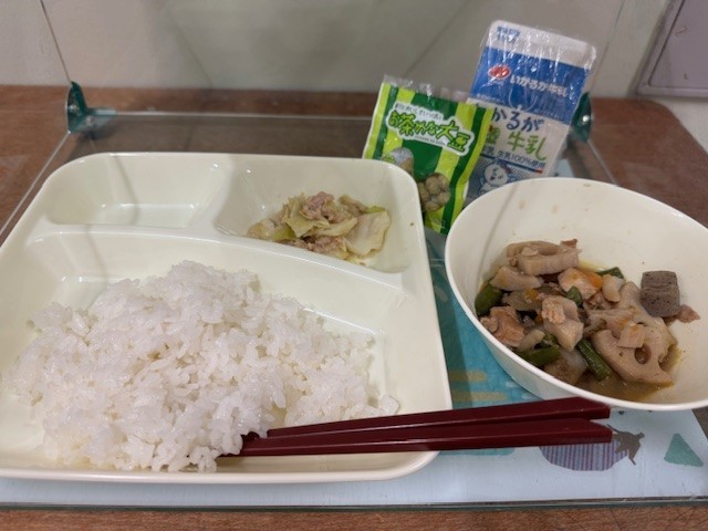 今日の給食は「筑前煮、ツナとキャベツのごまいため、まっ茶大豆、ごはん、牛乳」です。