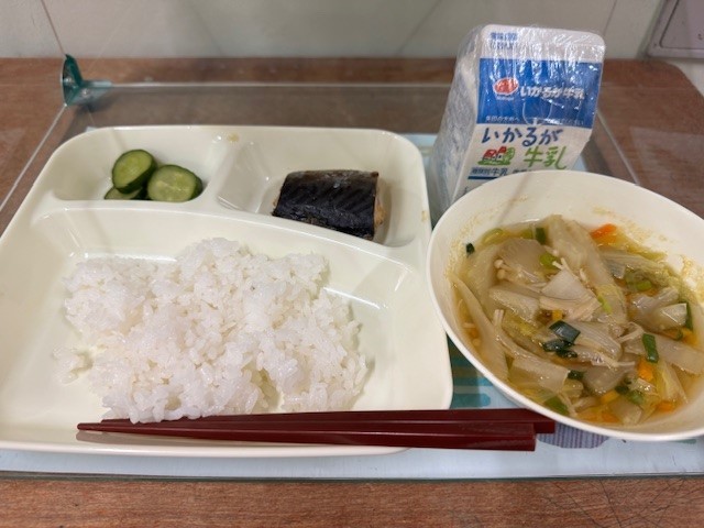 今日の給食は「さばのみそ煮、五目汁、きゅうりの甘酢づけ、ごはん、牛乳」です。
