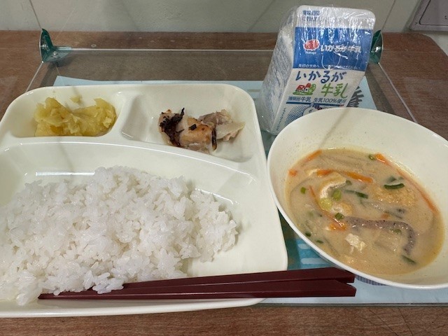 今日の給食は「鶏肉の塩こうじ焼き、かす汁、くりきんとん、ごはん、牛乳」です。