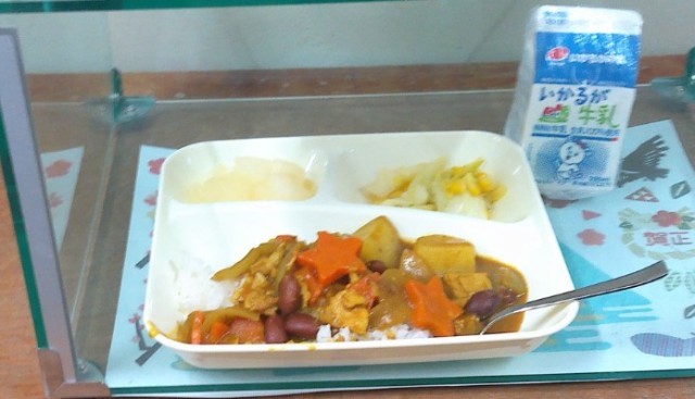 今日は、金時豆が入ったカレーライスです。豆類の苦手な子どもたちにも食べやすくしています。また、ラッキー人参も入っていました。