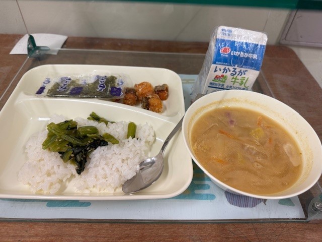今日の給食は「こまつなっ葉めし、きざみのり、さけの和風マリネソースかけ、じゃがいもとベーコンのみそ汁、ごはん、牛乳」です。