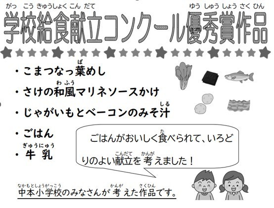 今日の給食は、大阪市立中本小学校の皆さんが考えた「令和6年度 学校給食献立コンクール優秀賞献立」です。