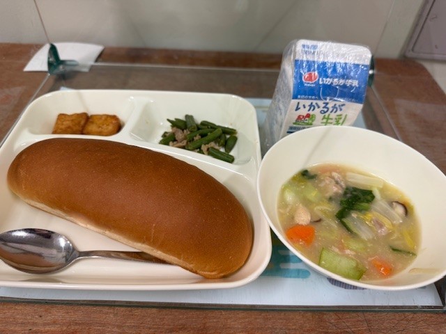 今日の給食は「はくさいのとろみ煮、あつあげのピリ辛じょうゆかけ、豚肉とさんどまめのオイスターソースいため、黒糖パン、牛乳」です。