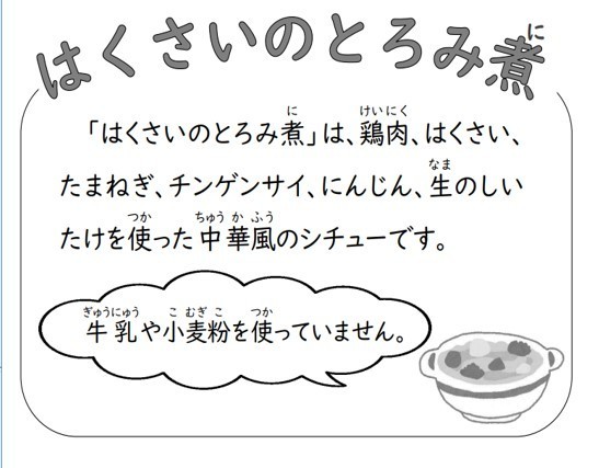 今日の白菜のとろみ煮は、料理酒で下味を付けた鶏肉、人参、玉ねぎ、白菜を綿実油で一度、炒めた後、湯を加えて煮ています。その後、チンゲン菜としいたけを加え、中華スープの素、シチュールウの素、塩こしょう、しょうゆで味付けをし、最後に水溶きでん粉でとろみが付けられています。