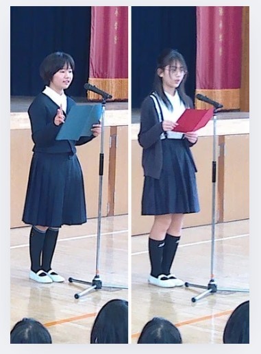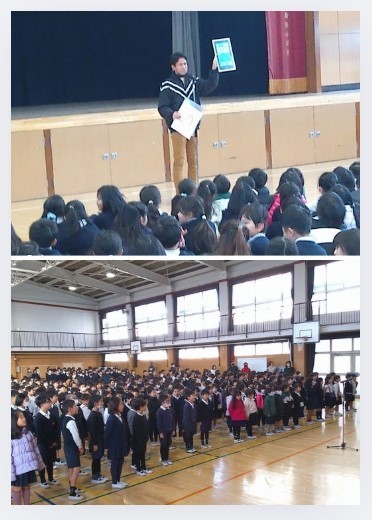 始業式では、転入生の紹介がありました。校長先生から今年の目標を決めましたか?という話と校長先生は人は一人では生きていけないものだから「繋(つながる)」ことを大切にしたいという話がありました。さらに生活指導の先生からは、早寝早起きをするためにも、目に刺激の強いものは寝る前の2時間前にはやめた方が良いという話もありました。6年生の児童による今年の抱負の発表もありました。とても上手に発表することができていました。
