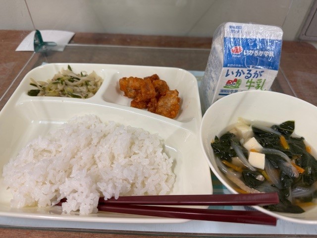今日の給食は「ヤンニョムチキン、とうふのスープ、切り干しだいこんのナムル、ごはん、牛乳」です。
