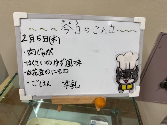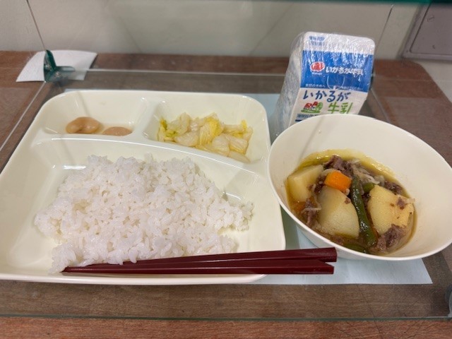 今日の給食は「肉じゃが、はくさいのゆず風味焼き、白花豆の煮もの、ごはん、牛乳」です。