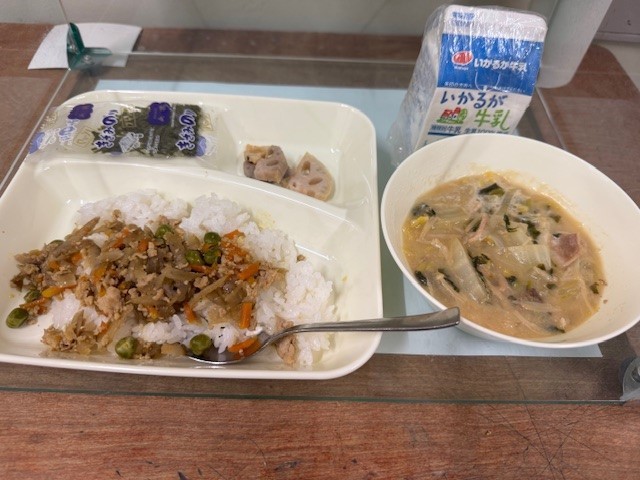 今日の給食は「鶏ごぼうご飯(きざみのり)、みそ汁、焼きれんこん、牛乳」です。
