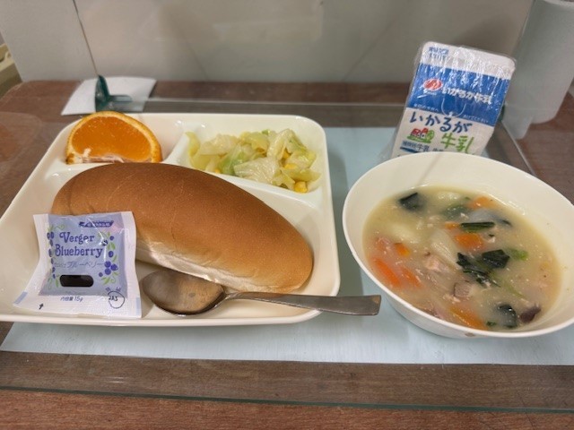 今日の給食は「鶏肉とほうれんそうのシチュー、キャベツとコーンのサラダ、デコポン、コッペパン、ブルーベリージャム、牛乳」です。