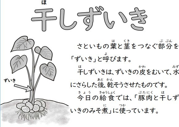 今日の給食は「豚肉と干しずいきのみそ煮、五目汁、焼きじゃが、ごはん、牛乳」です。