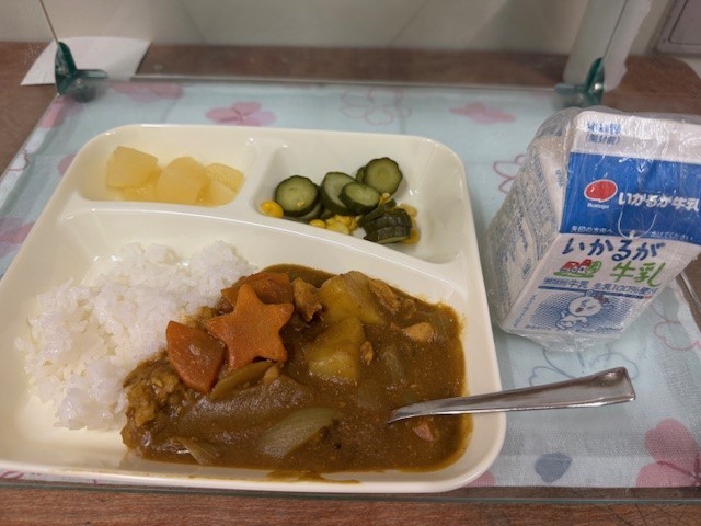 今日の給食は「チキンレバーカレーライス、きゅうりとコーンのサラダ、洋なし(カット缶)、ごはん、牛乳」です。