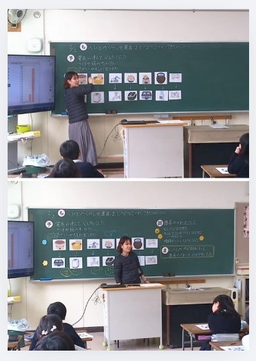 先週、昔の道具について、いろいろ教えていただいた3年生。今日はそれを踏まえて、昔と今の暮らしの違いについて考えました。