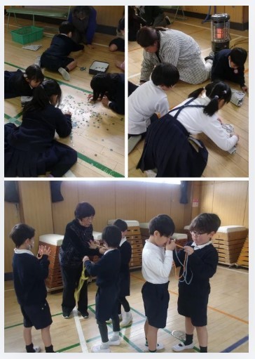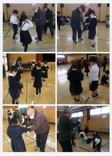 5日、地域の方々を特別講師にお迎えし、1年生が昔遊びを体験しました。